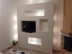 Gipskarton-Vorwandregal mit individuellen Einbaufächern und Einbautiefen nach Kundenwunsch und indirekter Beleuchtung.